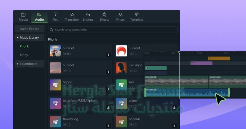 إمكانية إضافة ملفات صوتية أو تسجيلات صوتية كخلفية للمقطع.