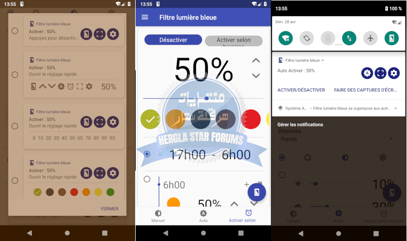 1. يضع فلتر/طبقة حمراء أو صفراء فوق الشاشة: يقوم التطبيق بتركيب طبقة شفافة ملونة على واجهة الجهاز تخفف من الضوء الأزرق. كلما زادت كثافة الفلتر، زادت نسبة حجب الضوء الأزرق وأصبح لون الشاشة أكثر دفئاً (مائلاً إلى الأحمر أو البرتقالي).