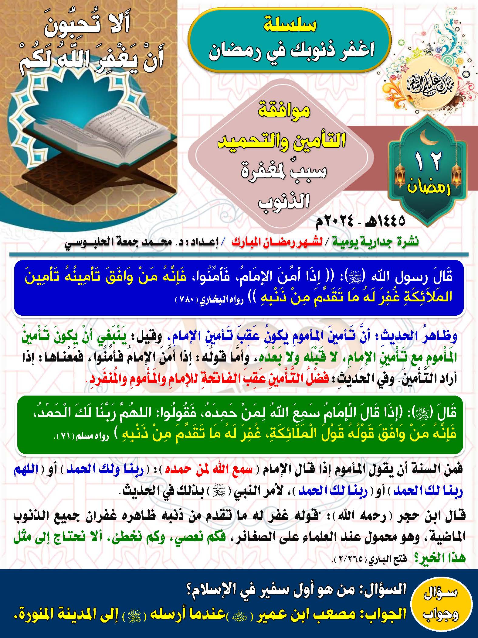 12 رمضان: موافقة التأمين والتحميد سبب لمغفرة الذنوب (بطاقة دعوية)